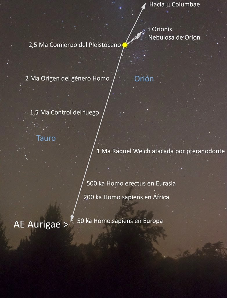Auriga es una constelación septentrional, bastante difícil de ver desde Bariloche. Pero casualmente, en diciembre, se me coló en varias fotos en las que intenté capturar la lluvia de Gemínidas. Aquí está. Marqué con una flecha su trayectoria durante los últimos 2 millones y medio de años (con eventos destacados por el camino). Flechas más cortitas marcan las trayectorias del centro de la Nebulosa de Orión (donde está el famoso Trapecio), y de la estrella Iota Orionis (la estrella más brillante de la Daga de Orión, que comentamos la semana pasada). Mu Columbae no cabe en esta foto, pero otra flecha marca hacia dónde está. Iota Ori es una binaria formada por dos estrellas de diferente edad: una de la edad de Mu Col, otra de la edad de AE Aur. ¡Ajá! Todas ellas estaban, hace dos millones y medio de años, en la misma región del espacio, el punto de donde salen las cuatro flechas y que marqué con una estrella amarilla. Qué promiscuidad.