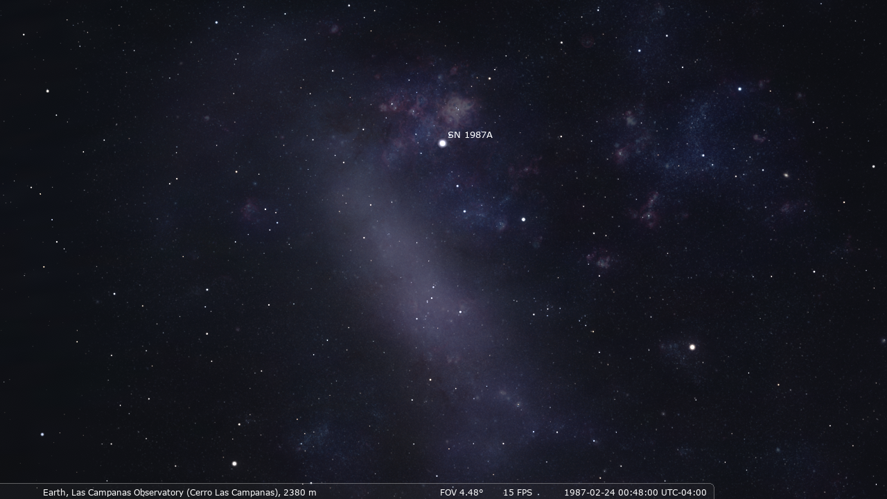 Las ilustraciones del cielo están hechas con Stellarium, usando un paisaje del Telescopio Swope que tomé de Google Street View. En Stellarium la magnitud de la supernova está exagerada porque el plugin de supernovas históricas usa un cálculo automático; tuve que hacer alguna manipulación para que no resultara más brillante que lo que realmente fue en la noche de su descubrimiento.
